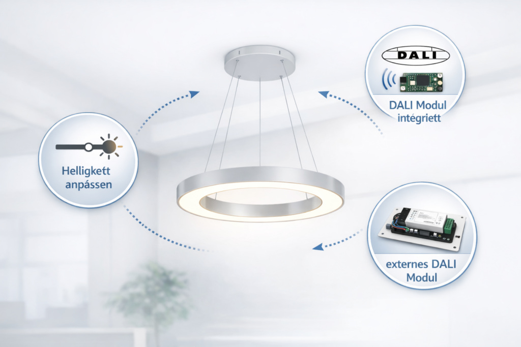 Möglichkeit der Integration eines DALI-Moduls für eine variable Beleuchtung direkt in die Leuchte, sofern der Platz dies zulässt.